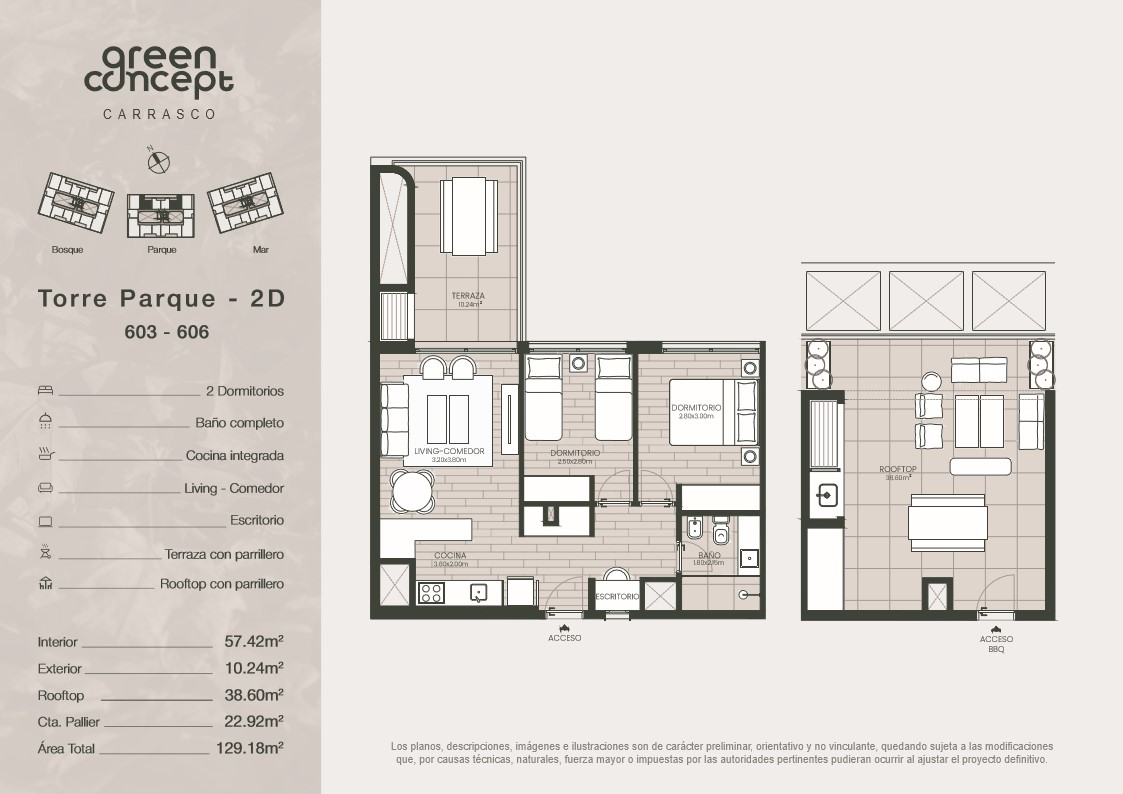 Lindante con un parque lineal y rodeado de un entorno cuidado se ubica Green Concept: Un desarrollo de 3 bloques de edificios bajos con entorno y centro verde. Se trata de una arquitectura contemporánea diseñada por RMA Arquitectos, que integra el entorno de manera respetuosa, incorporándolo en su interior. Unidades de 1, 2 y 3 dormitorios, unidos por un parque diseñado con todos los detalles, que lo convertirá en el lugar donde no veas la hora de volver todos los días. Apartamentos con vistas al parque, al bosque o al mar logrando una conexión única con el entorno, combinando un diseño moderno, con detalles de calidad y la naturaleza que lo rodea.